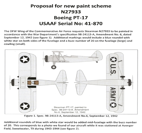 This PT-17 Stearman aircraft (serial number 41-870 / N27933) was built in 1940 by Stearman Aircraft in Wichita, Kansas. The aircraft was delivered to the U.S. Army Air Corp on November 4, 1940 and was assigned to the 62nd Flying Training Detachment at the Mississippi Institute of Aeronautics, Army Air Flying Training Command at Jackson Field, Jackson Mississippi. In November 1943 the aircraft was transferred to the 318th Flying Training Detachment, Women Airfare Service Pilots (WASP) School, Flying Training Command at Army Air Force at Avenger Field, Sweetwater, Texas.